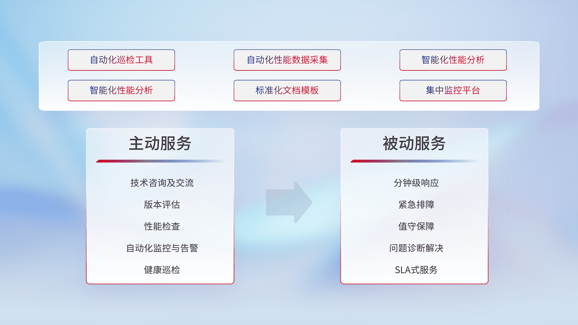 智能化工具和标准化文档,,,保障服务质量,,,,提供主动服务(包含技术咨询、、版本评估、、、性能检查、、、自动化监控与告警、、、、健康巡检)和被动服务包含(分钟级响应、、、、紧急排障、、、、值守保障、、、问题诊断解决、、、SLA服务)。。