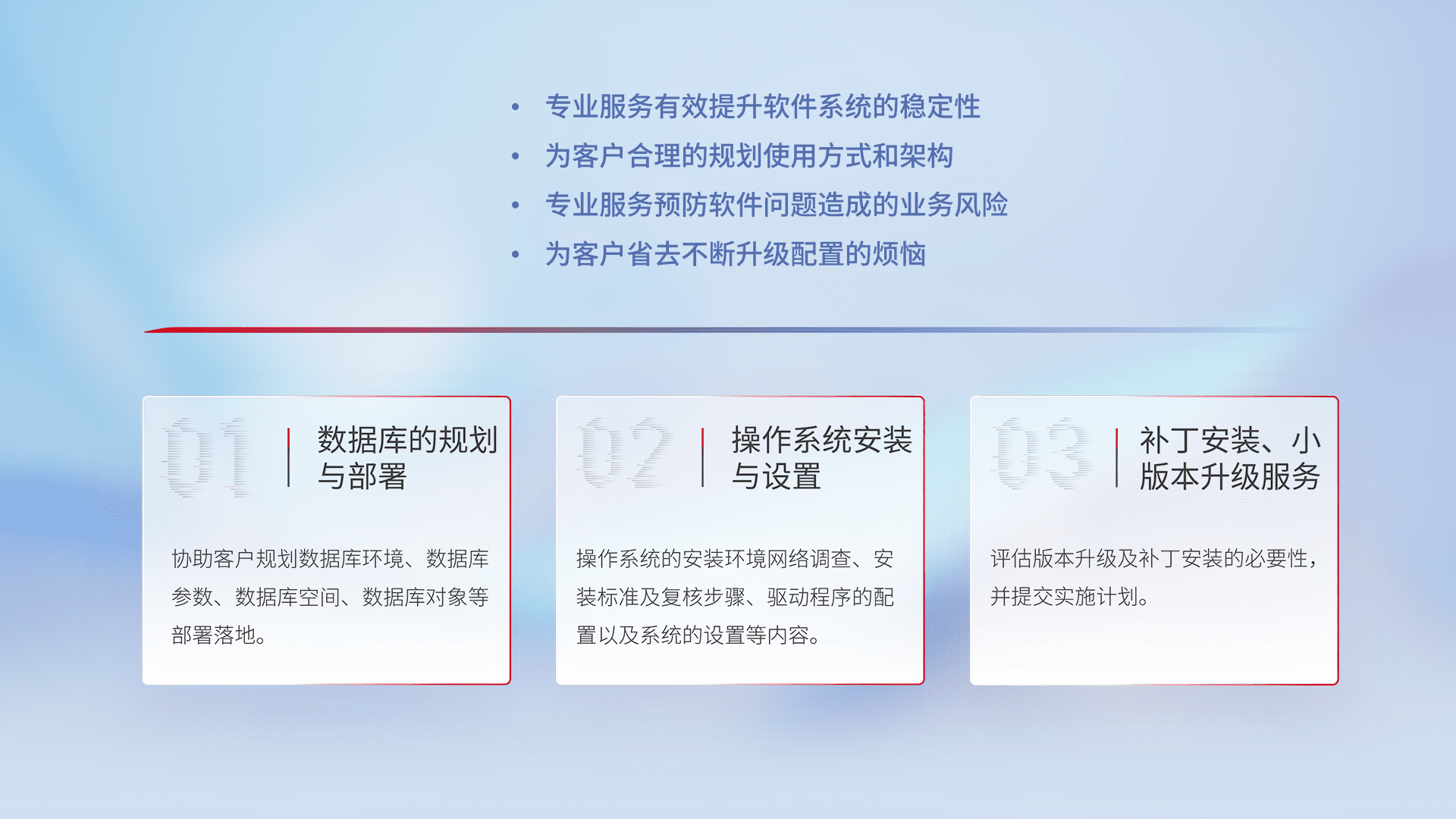 为客户提供软件规模升级、、、快速部署、、、、按需配置的专业服务,,从数据库的规划与部署到操作系统的安装与设置,,,再到补丁安装和小版本升级提供支持。。。。